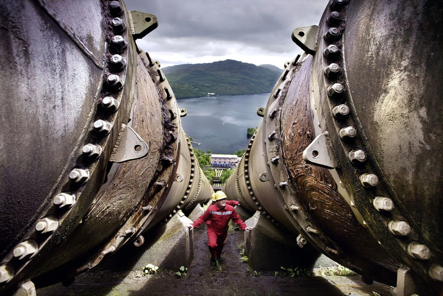 Photo: Looking down the pipes to the 150MW generating station at Loch Lomond, 277 metres below Loch Sloy. A second set of pipes will son be added to allow water to be pumped up from Loch Lomond. Photo: SSE Renewables.