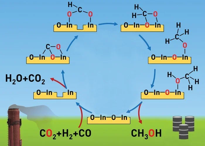 Image: Methanol synthesis from carbon dioxide and hydrogen. Vacancies on the surface of a ZrO2-supported In2O3 catalyst play a key role in the process. Credit: 改编自 Qingfeng Ge & Javier Pérez-Ramírez via C&E News.