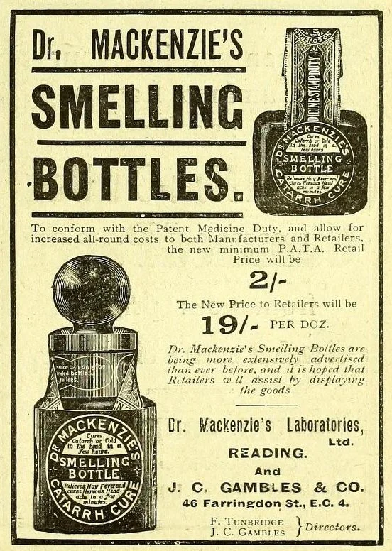 Photo: a historic British advertisement for an ammonia-based smelling bottle. At least the ammonia’s pungent smell would overwhelm unpleasant ambient odors associated with Victorian and Edwardian life. Public Domain.