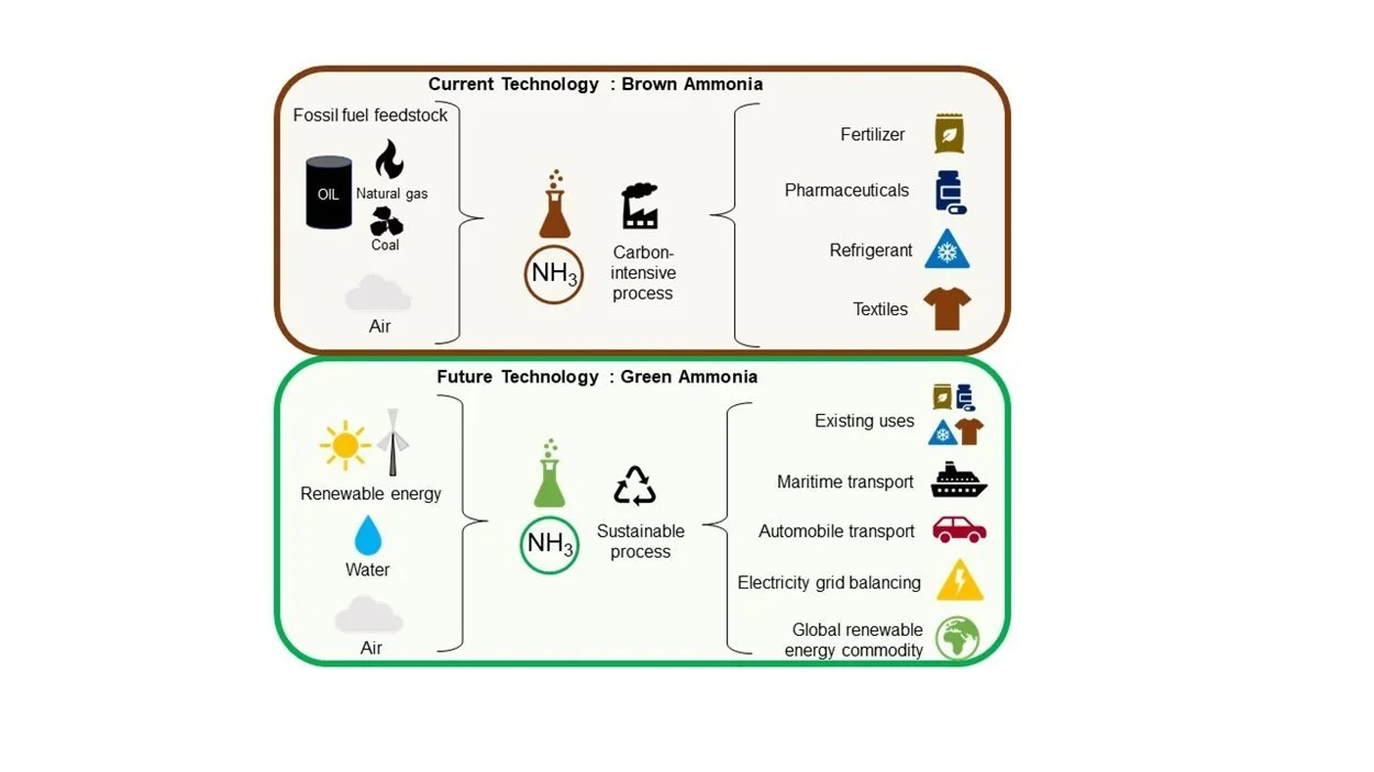 The overwhelming bulk of the world’s nitrate fertiliser production is made from ‘brown’ ammonia, produced by burning fossil fuels - mostly natural gas, but some coal is also used. This ‘brown’ ammonia can be replaced with Green ammonia, which is functionally identical.