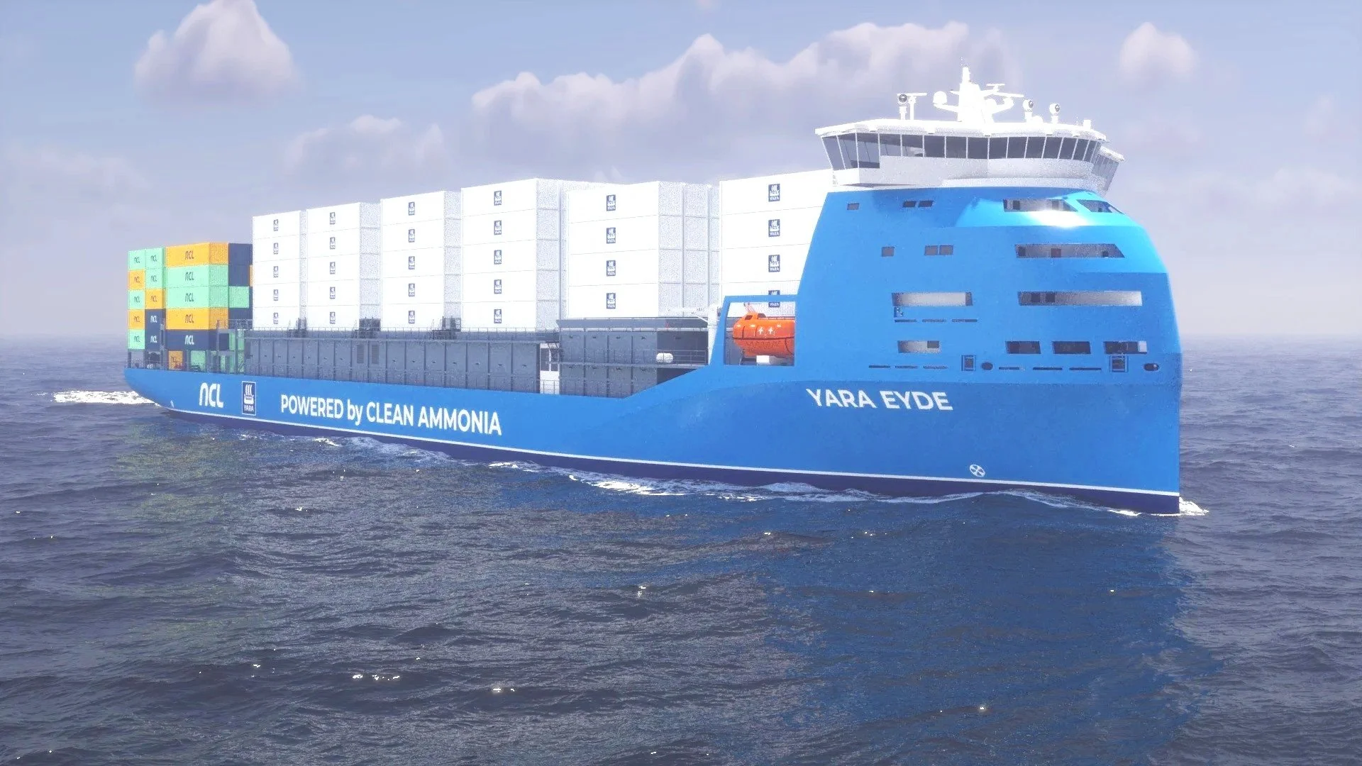 In another development, Yara Clean Ammonia, North Sea Container Line, and Yara International joined forces in 2023 to realize the world's first container ship (see visualisation) that will use clean ammonia as fuel, to be named the Yara Eyde.